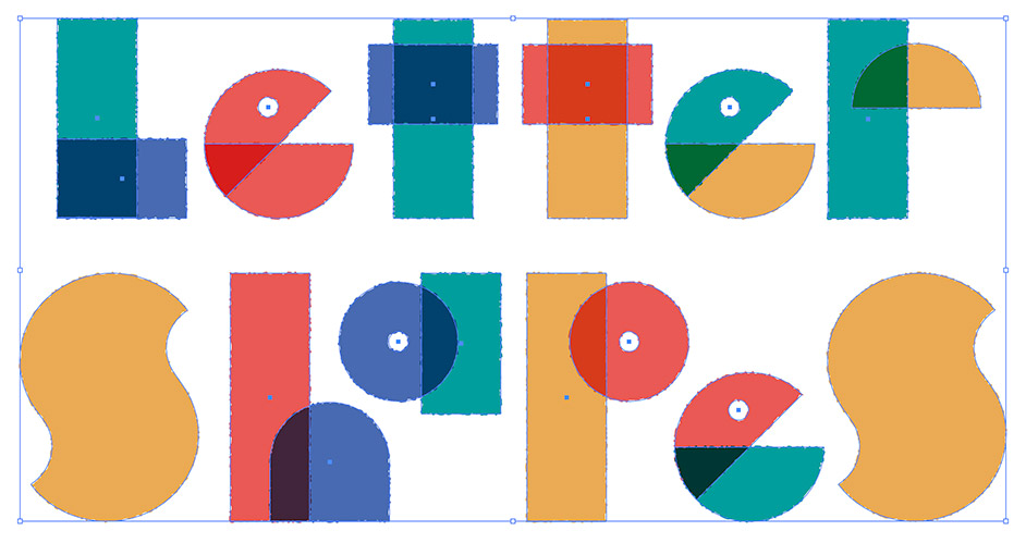 ロゴを仕上げていく。まず、「Letter」と「Shapes」の文字を上下に並べ、必要に応じて各文字の位置や文字間を調整しておく。文字の天地が揃うように配置するときれいな見た目になる(図54)。