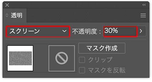 続いて、透明パネルで[描画モード:スクリーン]、[不透明度:30%]に設定して適用し、ざらっとしたアナログ的な質感を加えれば完成(図63)(図64)。