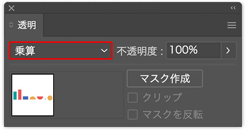 色分けした図形を組み合わせて文字を作っていく。まずは先ほど作成した図形を選択ツールですべて選択したら(図18)、透明パネルで[描画モード:乗算]に設定する(図19)。