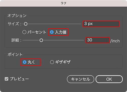 文字の配置や配色が調整できたら、すべての文字を選択してオブジェクトメニュー→“グループ”を実行し、グループ化しておく。その状態で効果メニュー→“パスの変形”→“ラフ...”を[サイズ:3px]、[入力値]、[詳細:30/inch]、[ポイント:丸く]で適用する(図56)(図57)。