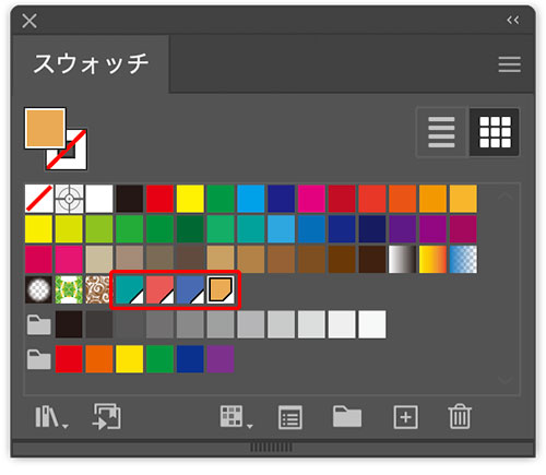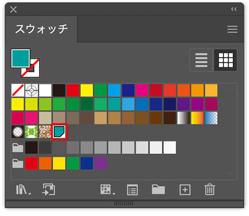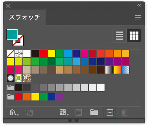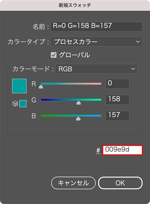 スウォッチパネル下部の[新規スウォッチ]ボタンをクリックすると(図12)、新規スウォッチダイアログが表示されるので、右下の[#]の右横に緑色の16進数カラーコード[009e9d]を入力して[OK]をクリック(図13)。これでスウォッチパネルにカラーを登録できる(図14)。同様の手順で、新規スウォッチとして赤[ea5855]と青[486ab2]、黄色[eaaa55]を登録しておく(図15)。
