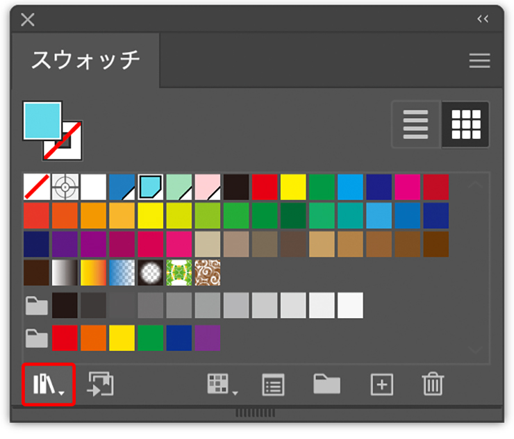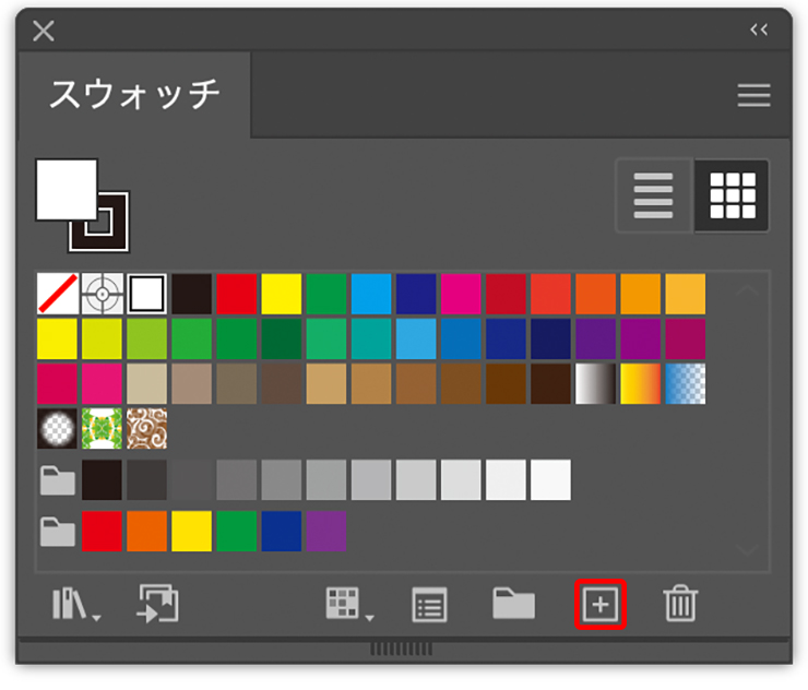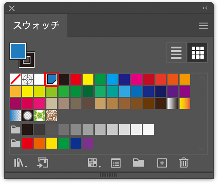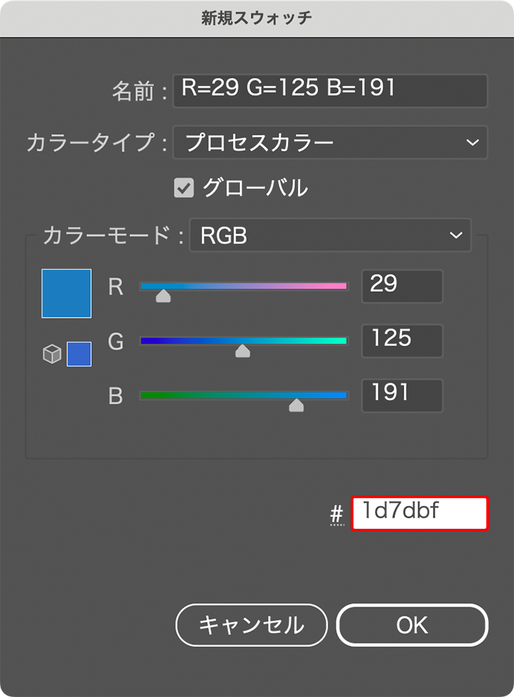 これらの色を後工程で簡単に使用するため、それぞれスウォッチに登録しておく。まず、スウォッチパネル下部の[新規スウォッチ]ボタンをクリックしたら(図1)、表示されるダイアログの右下の[#]と記された欄に紺色の16進数カラーコード[1d7dbf]を入力して[OK]をクリック(図2)。これでスウォッチパネルに指定した色が登録される(図3)。
