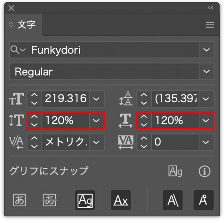 さらに文字ツールで「Spring」の文字を選択したら(図11)、文字パネルで[垂直比率:120%]、[水平比率:120%]に変更する(図12)(図13)。