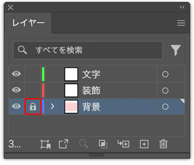 そのうち「背景」レイヤーを選択し、長方形ツールでアートボード大の長方形を作成したら、[塗り]を先ほどスウォッチに登録したピンクに、[線]を[なし]に設定し(図5)、レイヤーパネルで「背景」レイヤーの[ロックを切り替え]をクリックしてロックしておく(図6)。