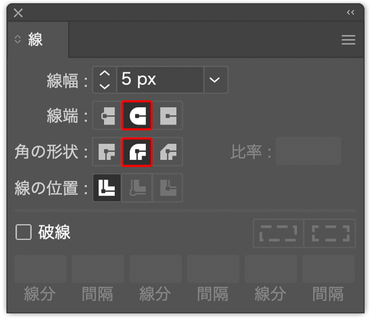 このままだと光沢部分の白い線の角が尖っているので、線パネルで[線端:丸型線端]、[角の形状:ラウンド結合]に変更して丸めておく(図48)(図49)。