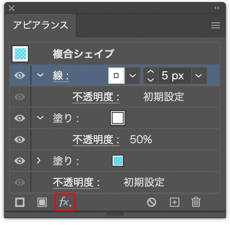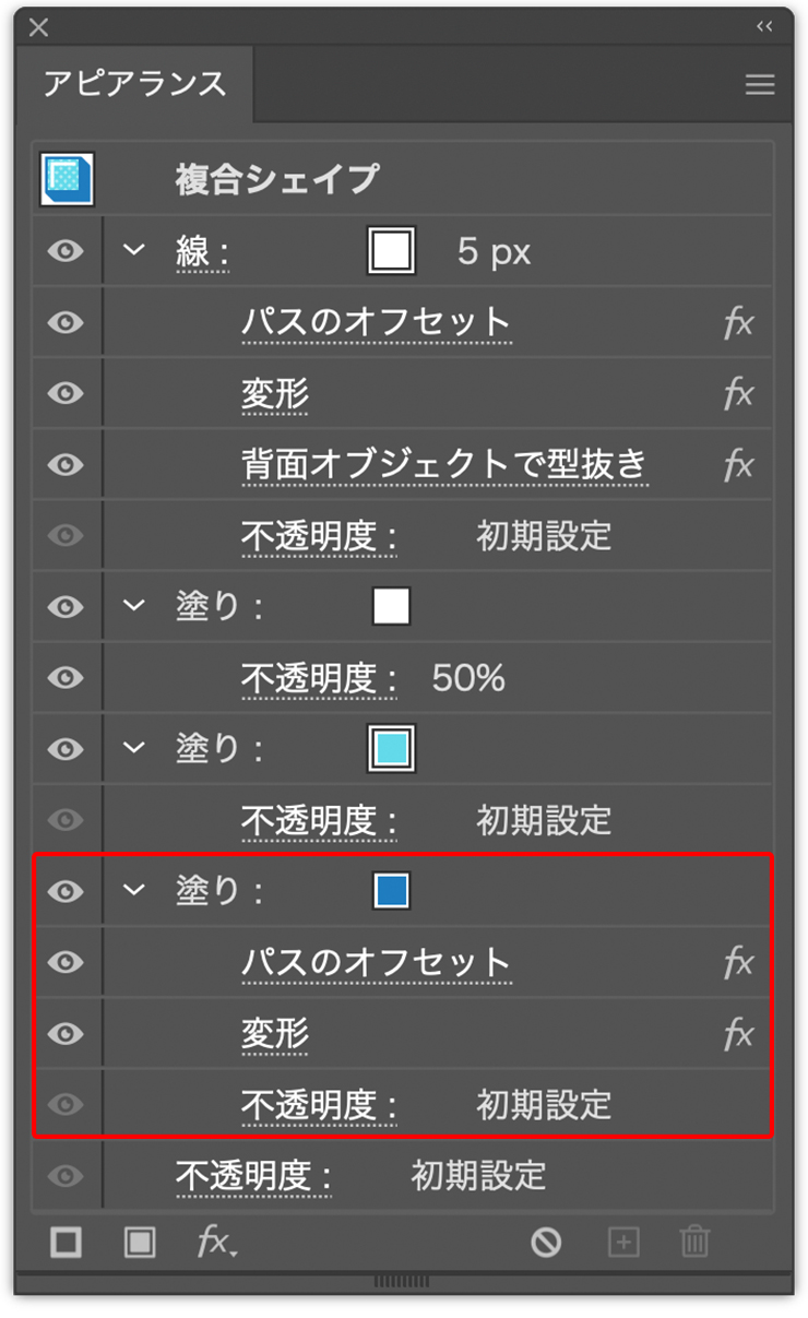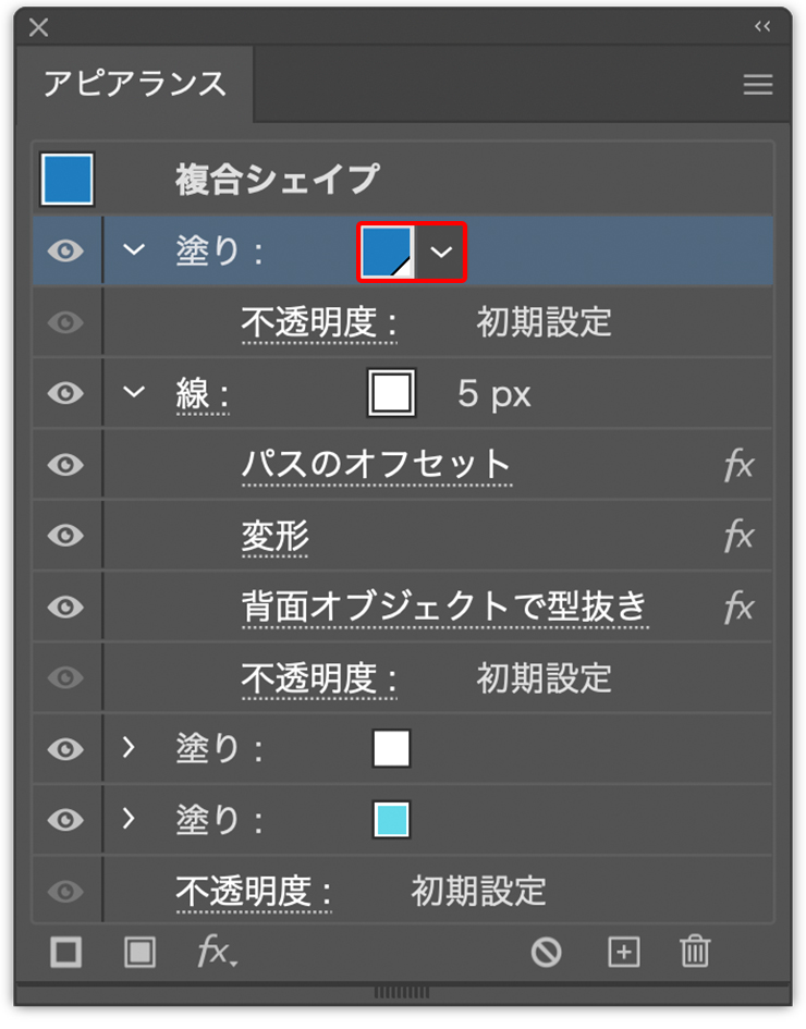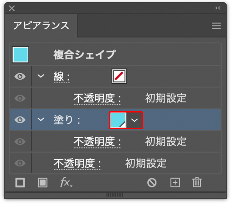 続いて、アピアランスパネルの[塗り]を先ほどスウォッチに登録した水色に変更したら(図17)(図18)、パネル下部の[新規塗りを追加]ボタンをクリック(図19)。