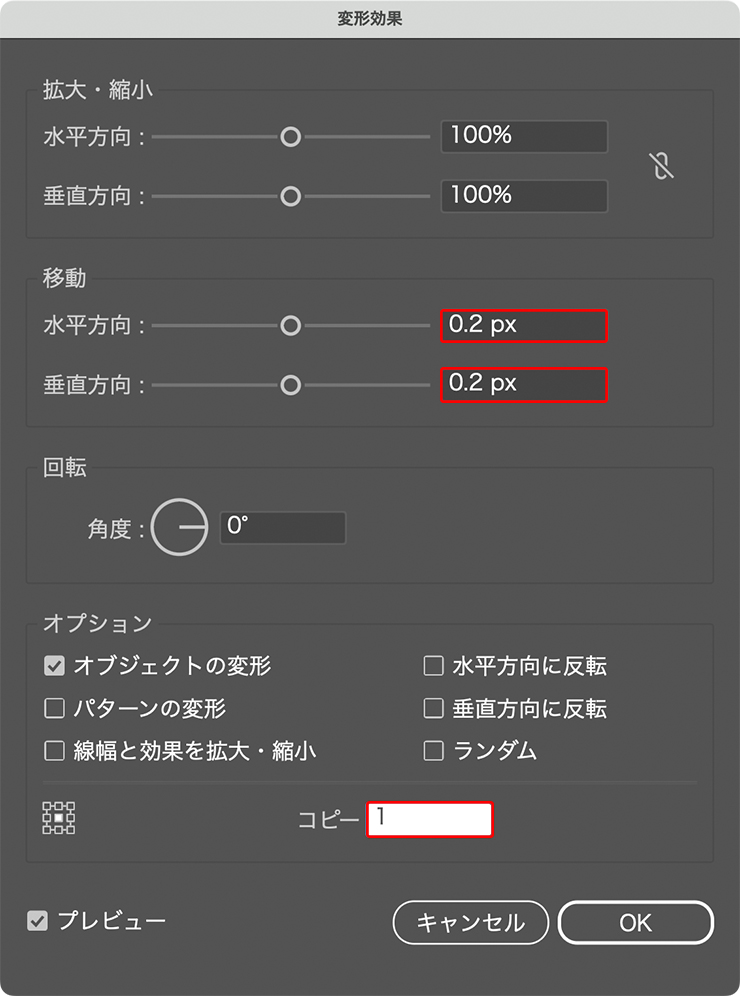 続いて[新規効果を追加]から“パスの変形”→“変形...”を選び、[移動]を[水平方向:0.2px]、[垂直方向:0.2px]、[コピー:1]に設定して適用する(図35)(図36)。