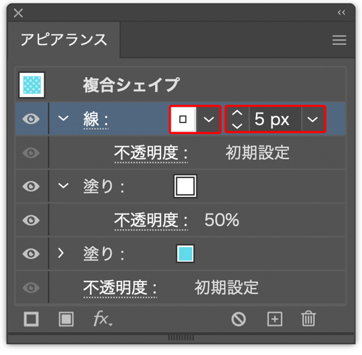 文字に光沢と影をつけていく。まず文字が選択された状態のまま、アピアランスパネルで[線]の色を白に変更して[線幅: 5px]に設定する(図30)(図31)。