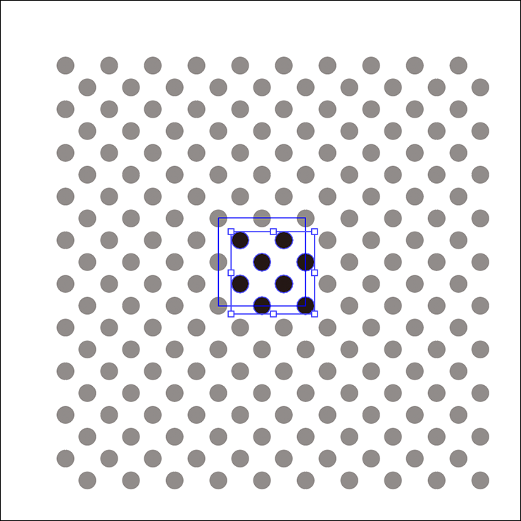その際、スウォッチパネルにも[10dpi 40%]が追加されるので、パネル上でそのパターンスウォッチをダブルクリック(図23)。パターン編集モードに切り替わるので、選択ツールで黒いドットを囲むようにドラッグしてすべて選択し(図24)、その[塗り]を白に変更(図25)。ウィンドウ上部の[完了]をクリックして適用する(図26)(図27)。