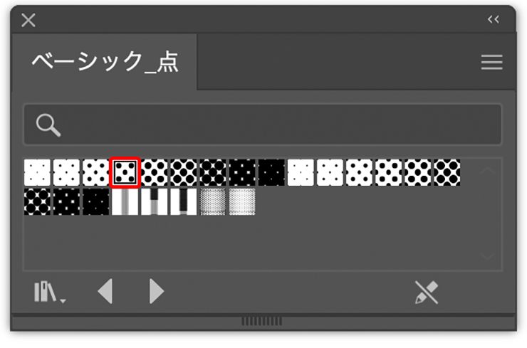 さらにスウォッチパネル下部の[スウォッチパネルライブラリメニュー]から“パターン”→“ベーシック”→“ベーシック_点”を選択(図20)。「ベーシック_点」パネルが表示されるので、[10dpi 40%]をクリックして適用する(図21)(図22)。