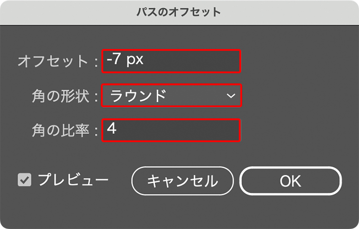 パネル上でこの[線]が選択された状態のまま、パネル下部の[新規効果を追加]から“パス”→“パスのオフセット...”を選び(図32)、[オフセット:ー7px]、[角の形状:ラウンド]、[角の比率: 4]で適用(図33)(図34)。