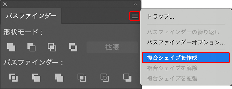 文字が選択された状態のまま、パスファインダーパネルの右上にある三本の水平線のアイコンからオプションメニューを開き、“複合シェイプを作成”を選択(図16)。