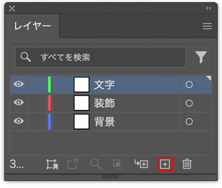 スウォッチが用意できたら、レイヤーパネル下部にある[新規レイヤーを作成]ボタンを2回クリックして2枚のレイヤーを追加したあと、それぞれレイヤー名の部分をダブルクリックして分かりやすい名称に変更しておく。ここでは背面から「背景」、「装飾」、「文字」とした(図4)。