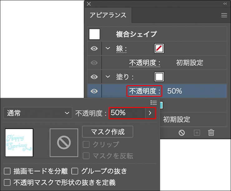 次に、選択ツールで文字を選択しなおしたら、アピアランスパネルで白いドットの[塗り]のすぐ下にある[不透明度]の文字をクリックして[不透明度: 50%]に変更する(図28)(図29)。