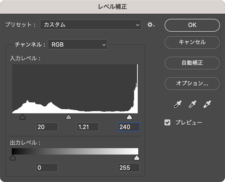 続いて、イメージメニュー→“色調補正”→“レベル補正...”を選び、[入力レベル]の各スライダーを動かして元写真にメリハリをつける。ここでは、シャドウと中間調、ハイライトのスライダーをそれぞれ動かして[シャドウ:20]、[中間調:1.21]、[ハイライト:240]として適用したが、写真によっても最適値は異なるのでプレビューを参考にしながら調整してみてほしい(図12)(図13)。