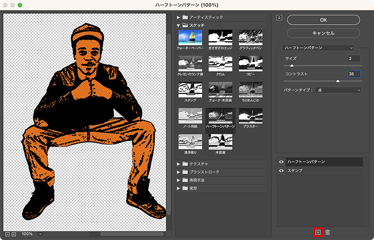 続いて新規エフェクトレイヤーを追加し、[スケッチ]の[ハーフトーンパターン]を[サイズ:2]、[コントラスト:35]、[パターンタイプ:点]で適用する(図6)(図7)。