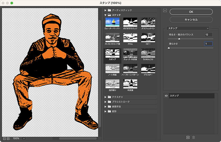 フィルターメニュー→“フィルターギャラリー”を選択し、[スケッチ]の[スタンプ]を[明るさ・暗さのバランス:12]、[滑らかさ:1]に設定する(図5)。