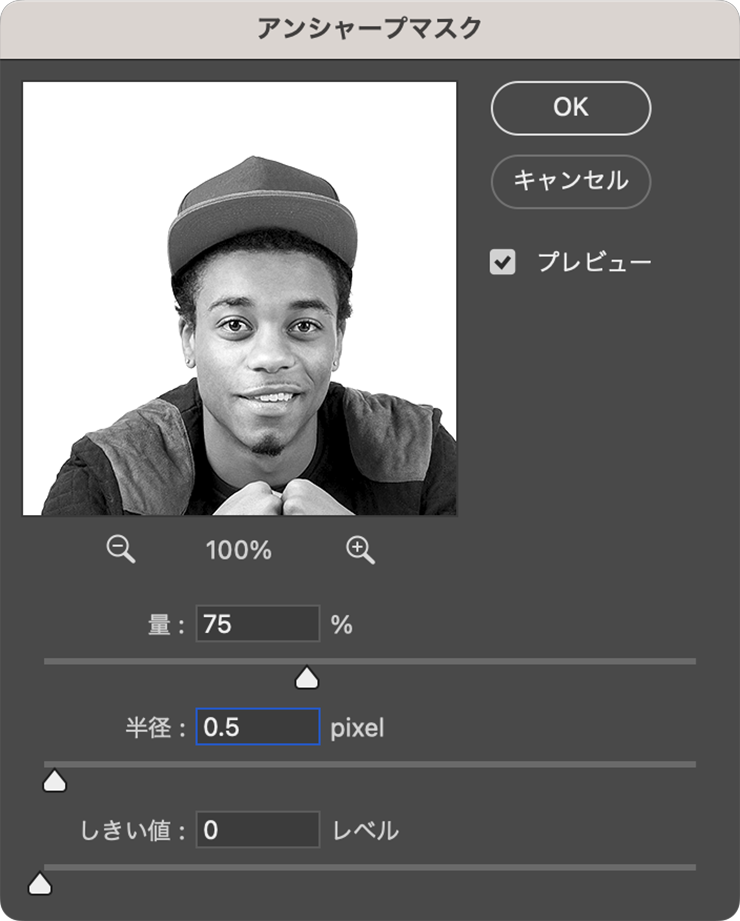 さらに元写真のレイヤーに対し、フィルターメニュー→“シャープ”→“アンシャープマスク...”を[量:75%]、[半径:0.5pixel]、[しきい値:0レベル]で適用する(図14)(図15)。