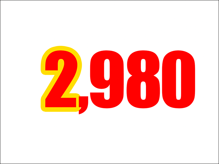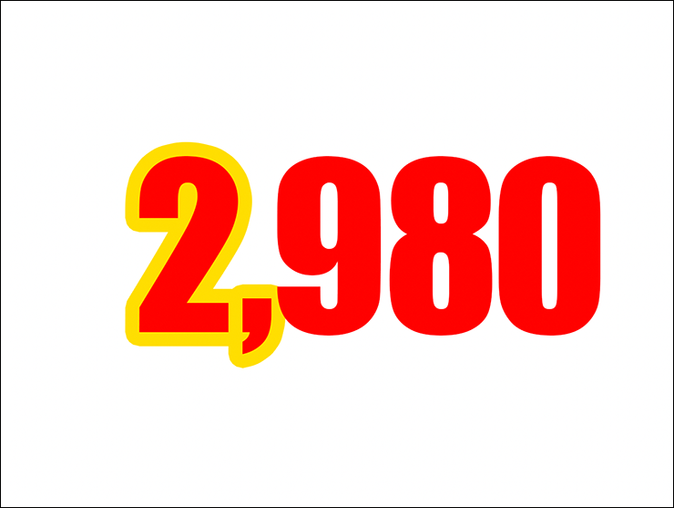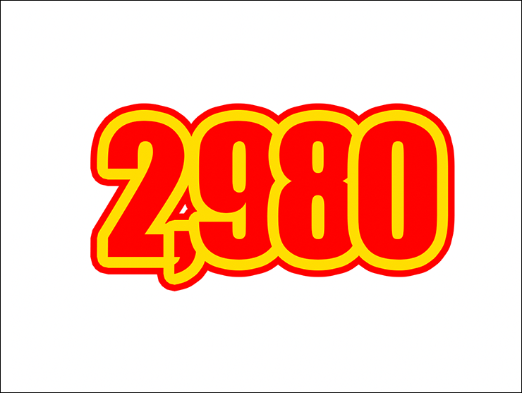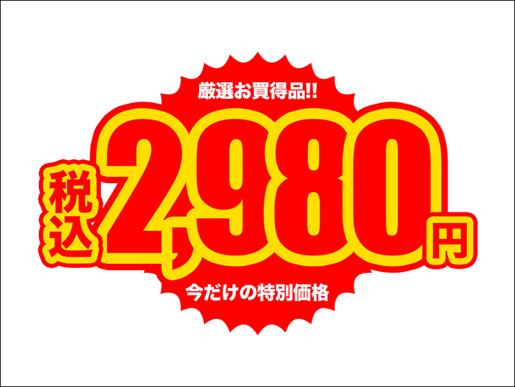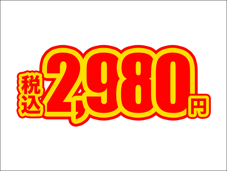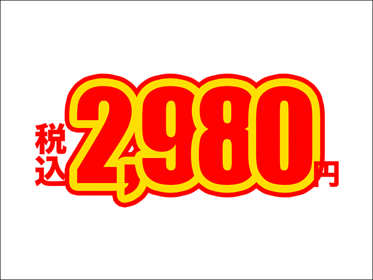 さらに、「税込」や「円」などの文字を配置して(図18)、それぞれレイヤーメニュー→“レイヤースタイル”→“境界線...”を[サイズ:15px]、[位置:外側]、[描画モード:通常]、[不透明度:100%]、[塗りつぶしタイプ:カラー]、[カラー]を黄色(ここでは16進数カラーコード[#ffde00])に設定(図19)。