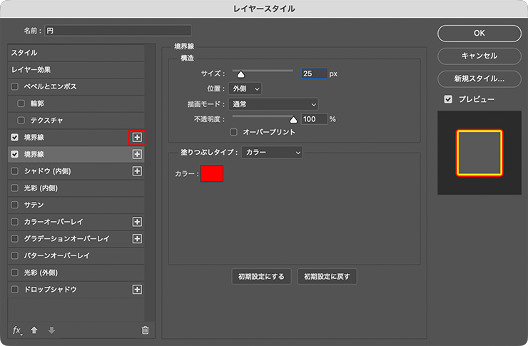 ダイアログのスタイル名の右横にある[+]ボタンをクリックして[境界線]を増やしたら、下の方を選択して[サイズ:25px]、[位置:外側]、[描画モード:通常]、[不透明度:100%]、[塗りつぶしタイプ:カラー]、[カラー]を赤(ここでは16進数カラーコード[#ff0000])に設定して適用する(図20)(図21)。
