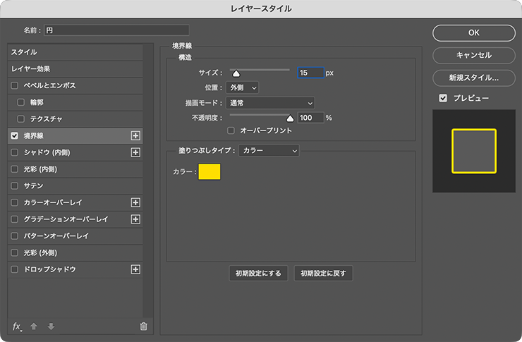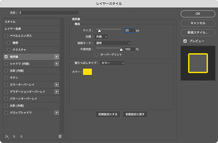 用意した文字に縁取りをつけていく。まずはレイヤーパネルで先ほど配置した文字のレイヤーのうち、いずれか一つを選択する。続いて、レイヤーメニュー→“レイヤースタイル”→“境界線...”を選び、[サイズ:25px]、[位置:外側]、[描画モード:通常]、[不透明度:100%]、[塗りつぶしタイプ:カラー]、[カラー]を黄色(ここでは16進数カラーコード[#ffde00])に設定して適用する(図8)(図9)。