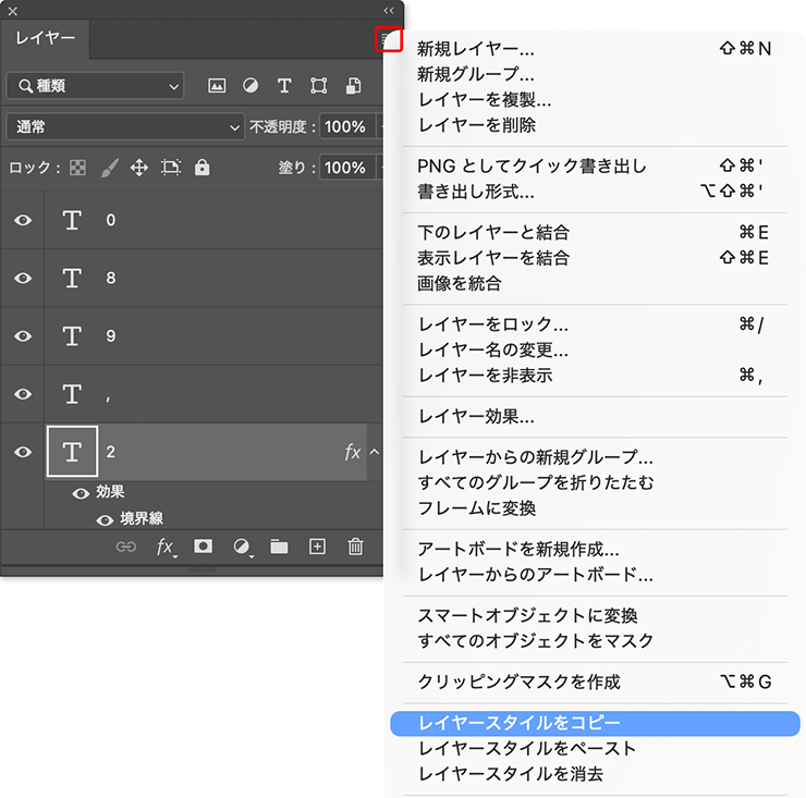 この境界線をつけたレイヤーが選択された状態のまま、レイヤーパネルメニュー→“レイヤースタイルをコピー”を選び(図10)、他の文字のレイヤーを選択したあと、レイヤーパネルメニュー→“レイヤースタイルをペースト”を実行(図11)。