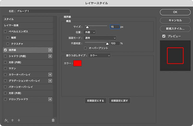 このレイヤーグループが選択された状態のまま、レイヤーメニュー→“レイヤースタイル”→“境界線...”を選び、[サイズ:15px]、[位置:外側]、[描画モード:通常]、[不透明度:100%]、[塗りつぶしタイプ:カラー]、[カラー]を赤(ここでは16進数カラーコード[#ff0000])に設定して適用する(図16)(図17)。