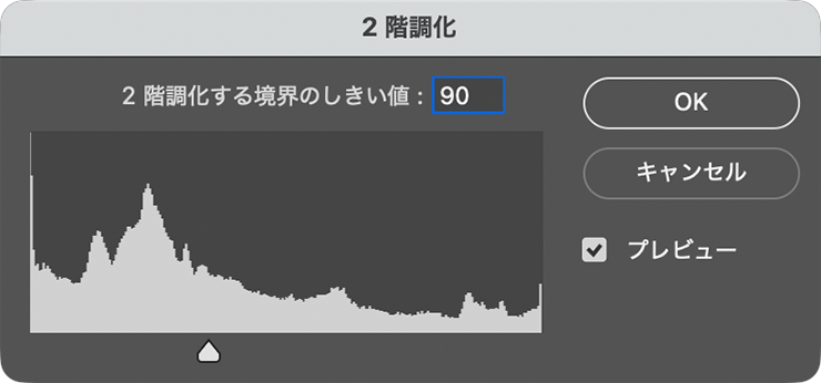 レイヤーパネルで先ほど非表示にした方のレイヤーを選択して表示させたら(図11)(図12)、イメージメニュー→“色調補正”→“2階調化...”を、[2階調化する境界のしきい値:90]で実行(図13)(図14)。