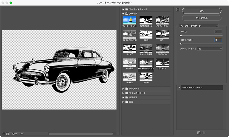 ビジュアルを仕上げていく。先ほど2階調化したレイヤーが選択された状態のまま、フィルターメニュー→“フィルターギャラリー...”を選択して[スケッチ]の[ハーフトーンパターン]を[サイズ:1]、[コントラスト:0]、[パターンタイプ:点]で適用する(図17)(図18)。