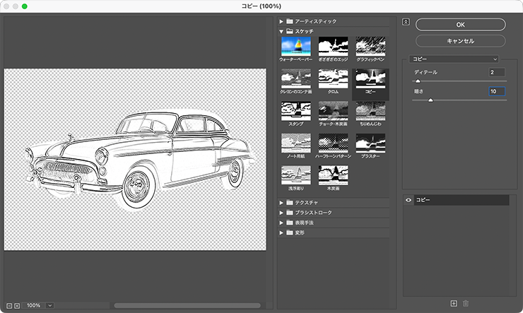 続いて、[描画色:黒]、[背景色:白]に設定したら、フィルターメニュー→“フィルターギャラリー...”を選択して[スケッチ]の[コピー]を[ディテール:2]、[暗さ:10]で適用する(図6)(図7)。