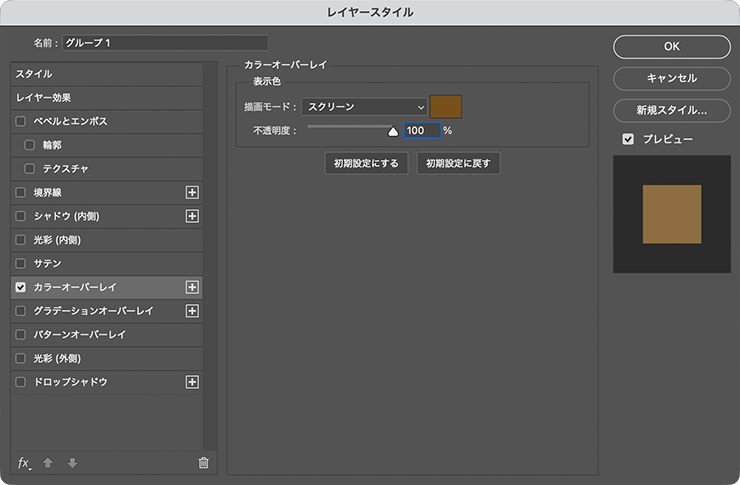 このレイヤーグループが選択された状態のまま、レイヤーメニュー→“レイヤースタイル”→“カラーオーバーレイ...”を、[描画モード:スクリーン]、[オーバーレイのカラー]を茶色(ここでは16進数カラーコード[#775019])、[不透明度:100%]で適用する(図21)(図22)。