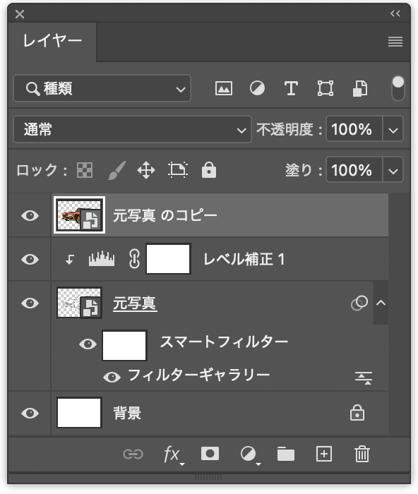次に、レイヤーメニュー→“スマートオブジェクト”→“スマートオブジェクトに変換”を実行(図4)。この元写真のレイヤーを前面に複製したら、複製した方を非表示にし、複製元のレイヤーを選択する(図5)。