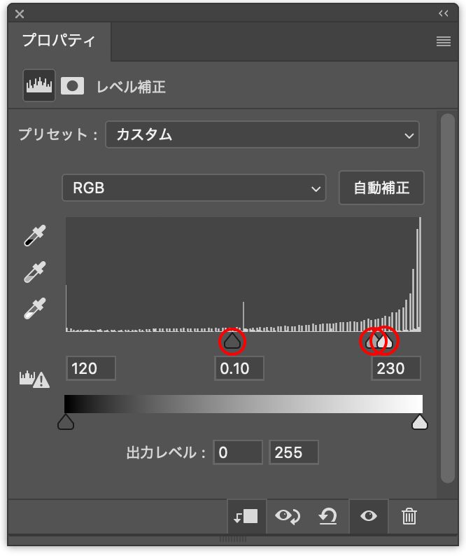 続いて、プロパティパネルでシャドウ、中間調、ハイライトのスライダーをそれぞれドラッグし、輪郭線が際立つように調整する(図9)(図10)。ここでは[シャドウ:120]、[中間調:0.10]、[ハイライト:230]となるよう調整したが、画像や表現したいイメージによっても最適値は異なるのでプレビューを確認しながら適宜調整してみてほしい。