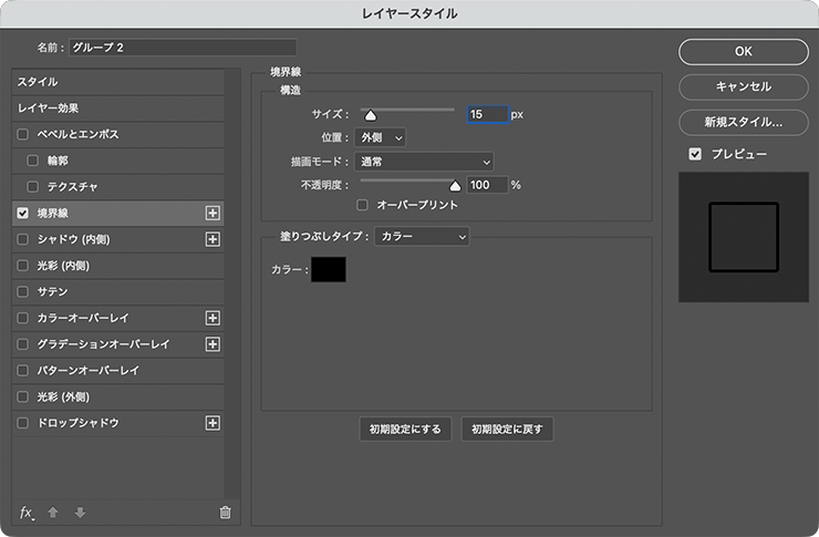 この外側のグループフォルダー(ここでは「グループ2」)が選択された状態のまま、レイヤーメニュー→“レイヤースタイル”→“境界線...”を選び、[サイズ:15px]、[位置:外側]、[描画モード:通常]、[不透明度:100%]、[塗りつぶしタイプ:カラー]、[カラー:黒]で適用する(図13)(図14)。