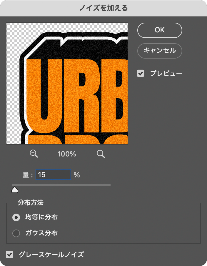 続いて、フィルターメニュー→“ノイズ”→“ノイズを加える…”を[量:15%]、[分布方法:均等に分布]、[グレースケールノイズ]で適用する(図21)(図22)。