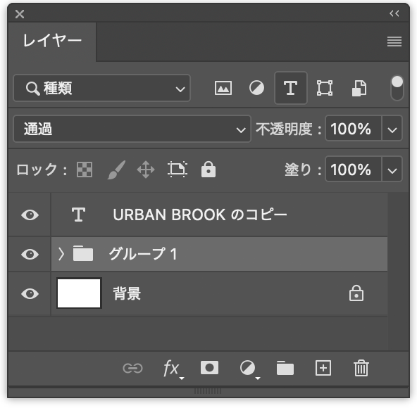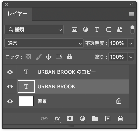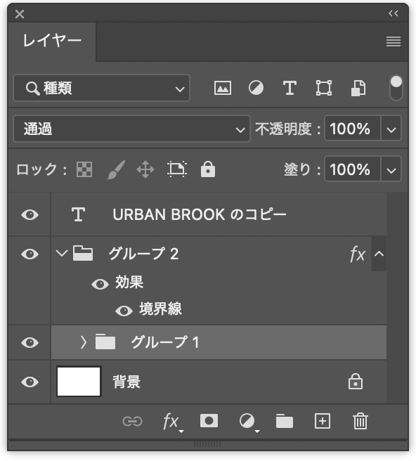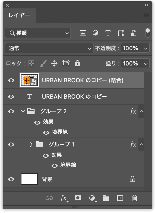 ロゴを仕上げていく。まず、レイヤーパネルで背景レイヤー以外をすべて選択したあと(図18)、option+command+Eキー(Macの場合。WindowsではAlt+Ctrl+Eキー)を押す(図19)。これにより、選択したレイヤーやレイヤーグループを複製したうえで結合することができる。