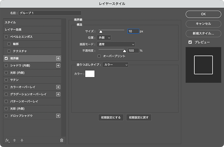 次に、レイヤーパネルで内側のグループフォルダー(ここでは「グループ1」)を選択したら(図15)、レイヤーメニュー→“レイヤースタイル”→“境界線...”を選び、[サイズ:10px]、[位置:外側]、[描画モード:通常]、[不透明度:100%]、[塗りつぶしタイプ:カラー]、[カラー:白]で適用する(図16)(図17)。