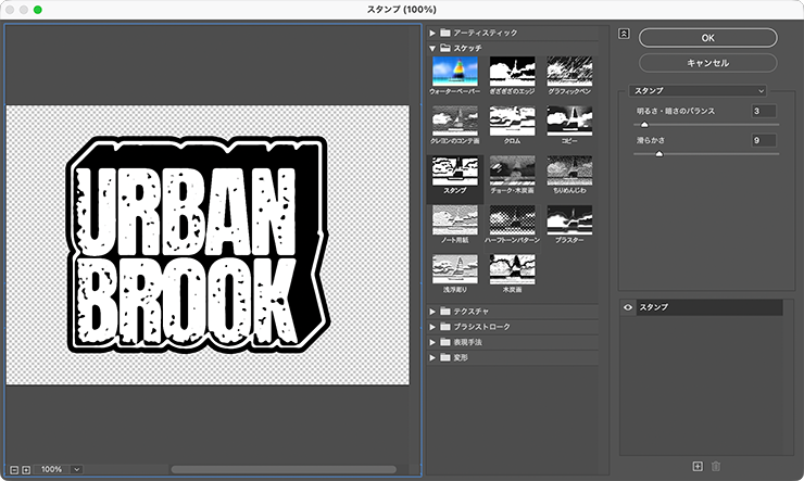 [描画色]を黒、[背景色]を白にしたあと、フィルターメニュー→“フィルターギャラリー...”を選び、[スケッチ]の[スタンプ]を[明るさ・暗さのバランス:3]、[滑らかさ:9]で適用(図23)(図24)。