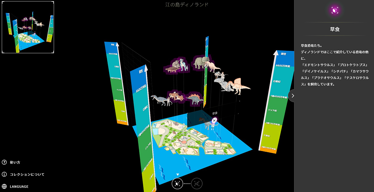 コンテンツの一例として、会場の空間内にはブラキオサウルスなどの恐竜が登場。スマホのブラウザを通じてAR体験ができる「Web AR」により、現代の建物の中に恐竜が現れるというバーチャル体験ができる。3Dプリンタで作成された恐竜の模型も展示。恐竜の3Dデータには、イラストレーターの加藤愛一氏が制作したものが活用された。
