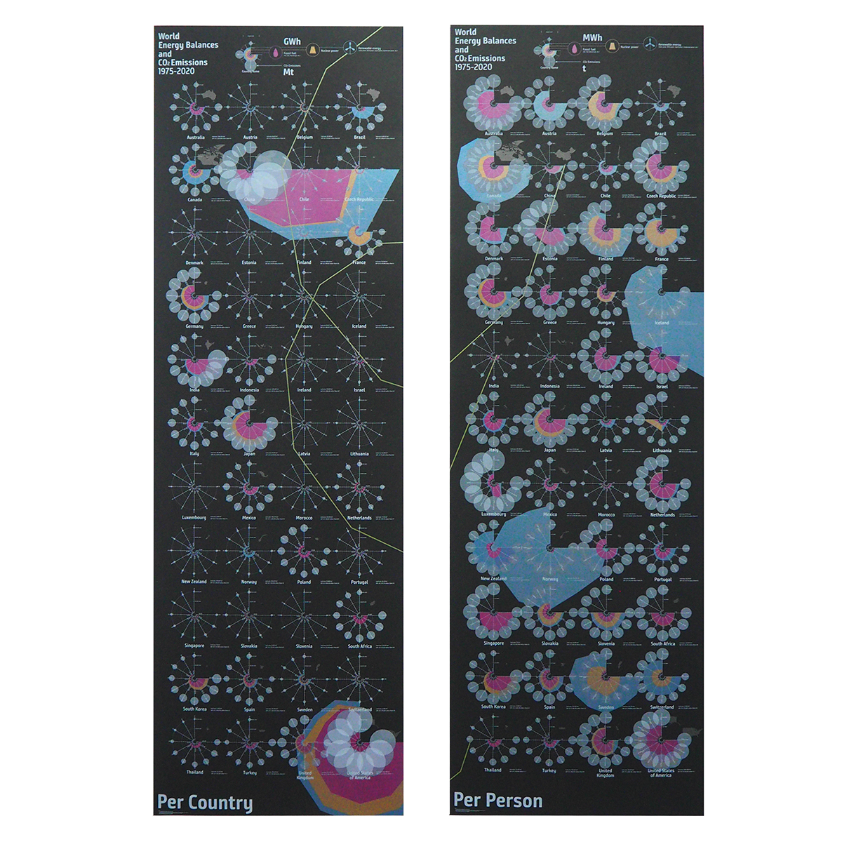 「大判印刷物」部門の第1位は、株式会社サン・ブレーンの「Infographic Poster - World Energy Balances and CO2 Emissions 1975-2020 –」。世界のエネルギー収支とCO2排出量を題材にしたインフォグラフィック作品で、スタイリッシュなデザインです。