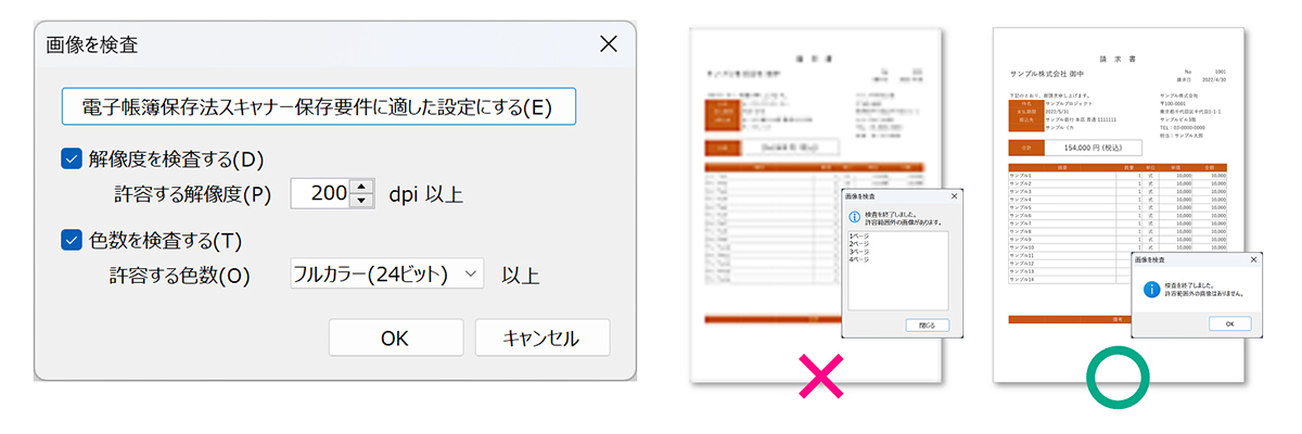 さらに新バージョンでは、電子帳簿保存法で規定されているスキャナーの保存要件(解像度200dpi以上/256階調以上・24bitカラー)を満たしているか、文書中の画像の検査ができます。個人事業主や企業にとって便利な機能です。
