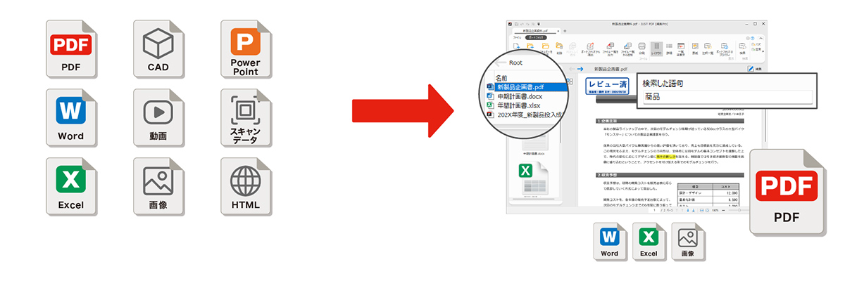 PDFの作成機能では、オフィスソフトをはじめ、各種のアプリケーションからワンクリックで簡単にPDFを作ることが可能です。データ変換機能では、反対にPDFをほかのデータ形式に変換でき、まとめて複数ファイルの一括変換もできます。