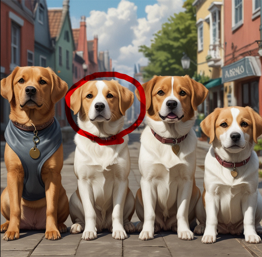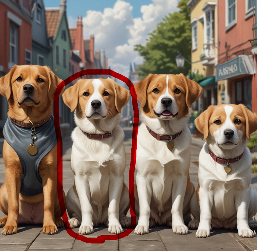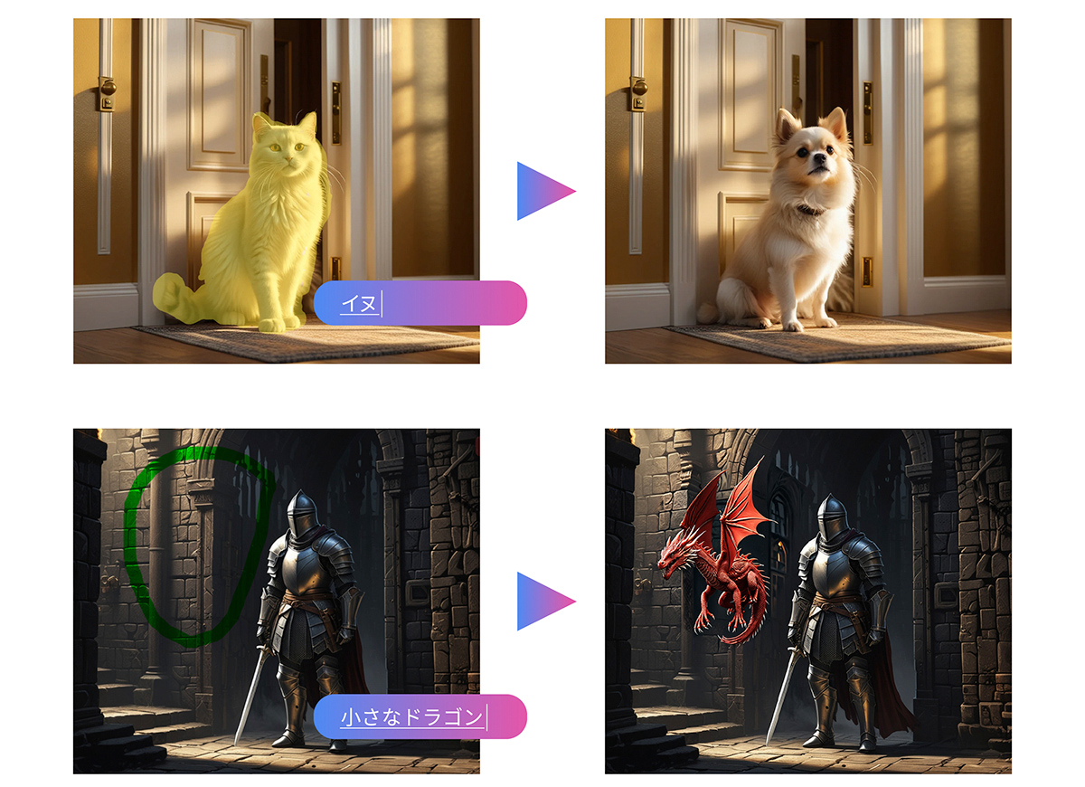たとえば複数の犬が並んでいる画像の場合、1匹の犬の顔だけを指定すると、不自然にならないように単なる消去ではなく、その部分には別の顔が生成されます。