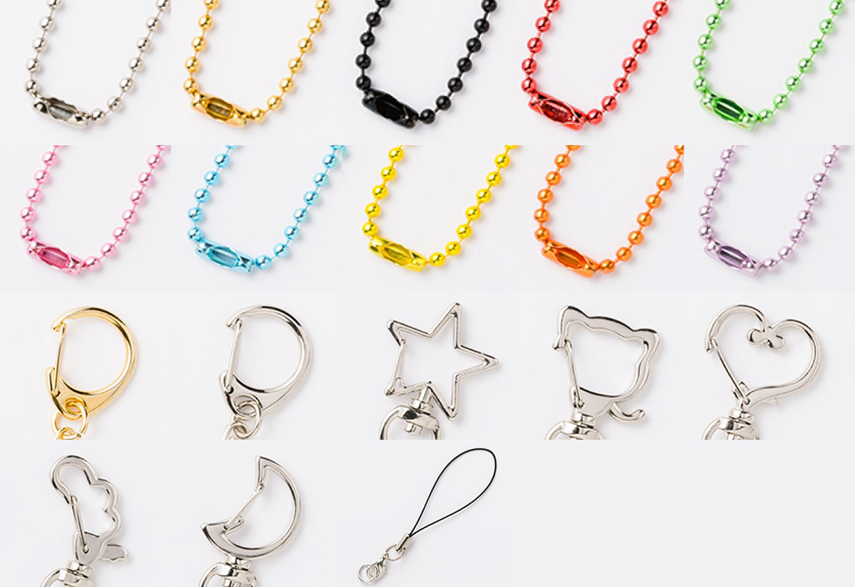 本商品では、ボールチェーンやナスカンなどの中から無料で1つストラップを選ぶことができ、用意されているバリエーションは18種類です。ストラップホールは9mmの円に直径3mmの穴を開ける形で作成し、穴がカットパスに接するように配置します。ストラップホールの外径の中には印刷ができないため、ホールの周囲はデザインを避けて作成することが重要です。