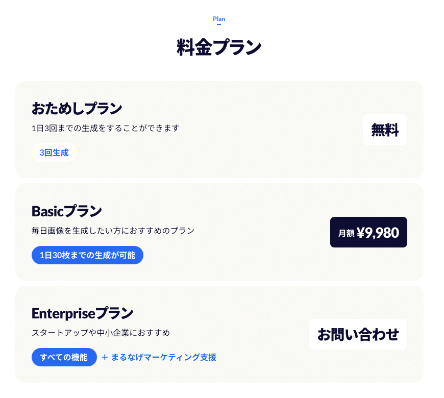 本サービスでは、「毎日画像を生成したい方におすすめ」とされている「PROプラン(サービスサイト内の一部ではBasicプランと表記)」や、さらに上位版で大型運用・チーム向けの「ENTERPRISEプラン」に加え、無料の「おためしプラン」も提供されています。「おためしプラン」では、ログインなしでも1日3回までの生成が可能です。