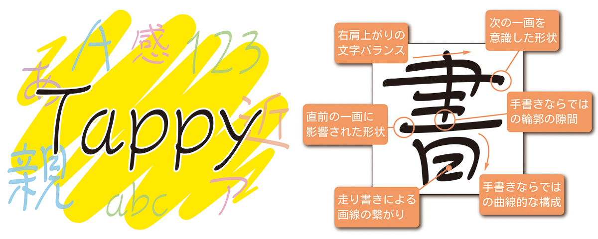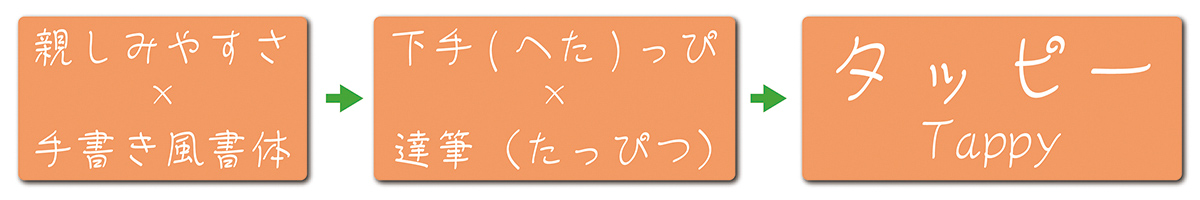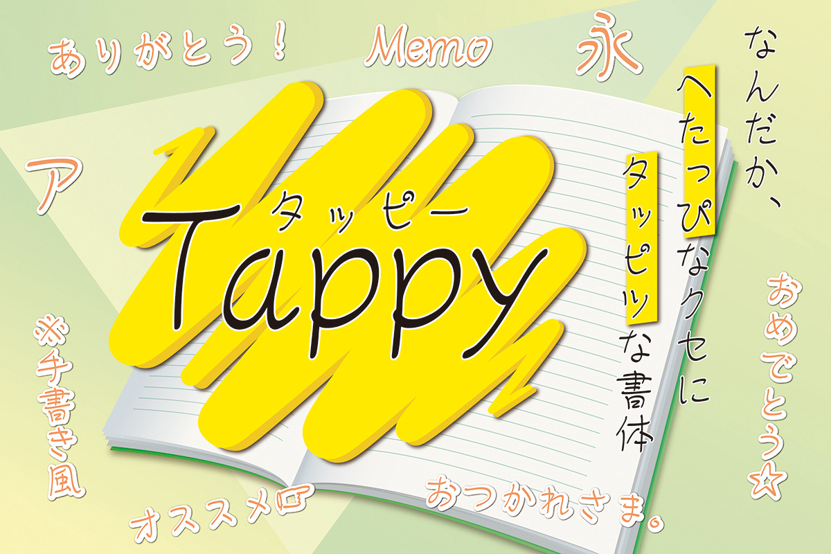 書体の名前も、「下手(へた)っぴ」でありながら「達筆(たっぴつ)」でもあることから「タッピー」に決まりました。誰かに宛てたメッセージに使うのが最適で、CMや食品・飲料のパッケージ、学園生活をテーマにした映画やドラマ・アニメ作品とも相性が良いフォントです。