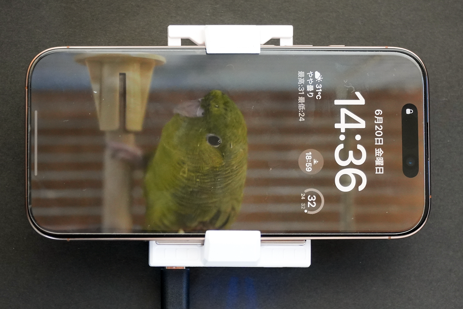 スマホへの装着は、側面にある伸縮するパーツを引っ張り、スマホを挟み込むだけです。前面から見ても挟み込むパーツは液晶画面にかからないので、操作や閲覧のジャマにはなりません。