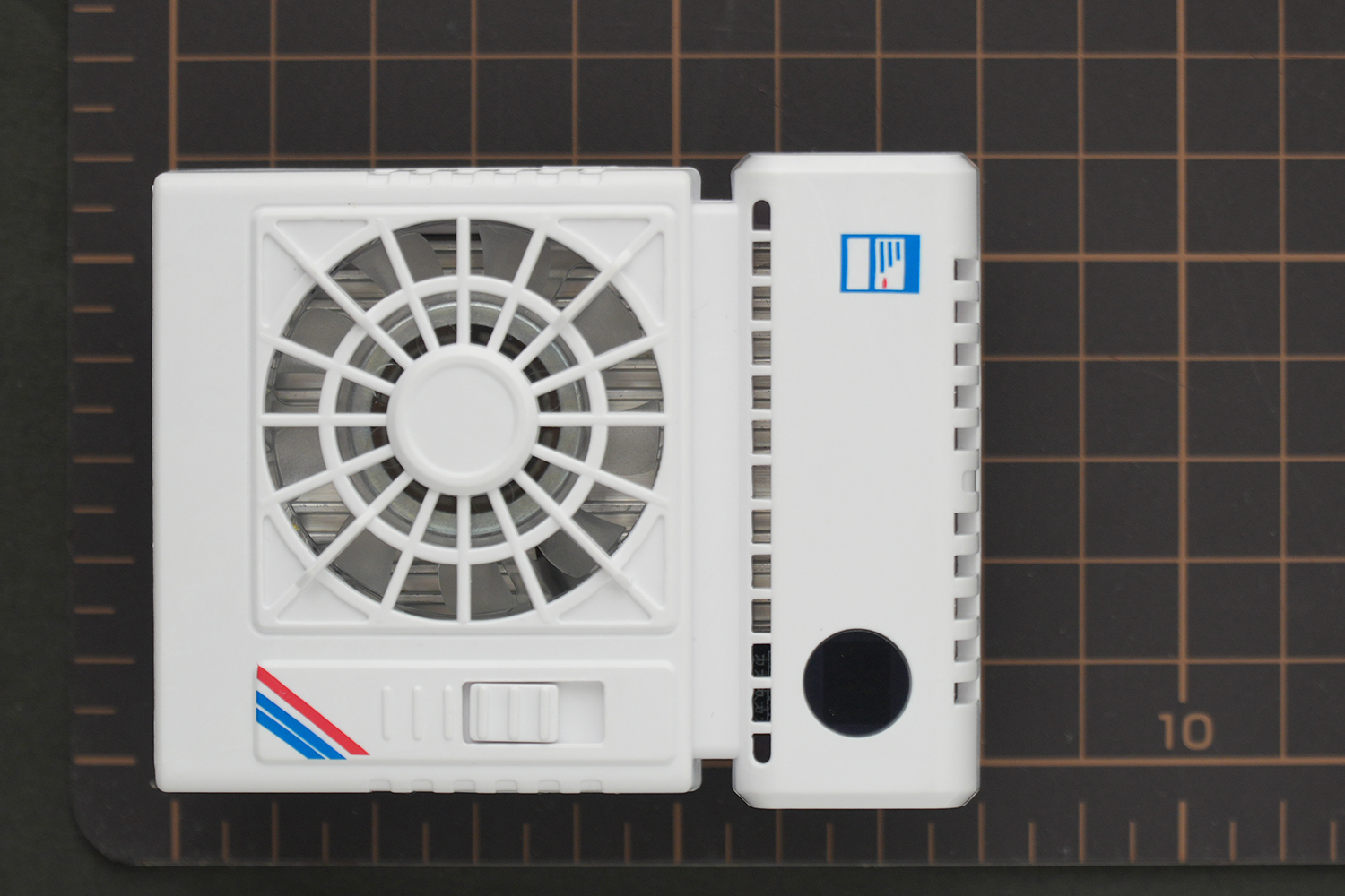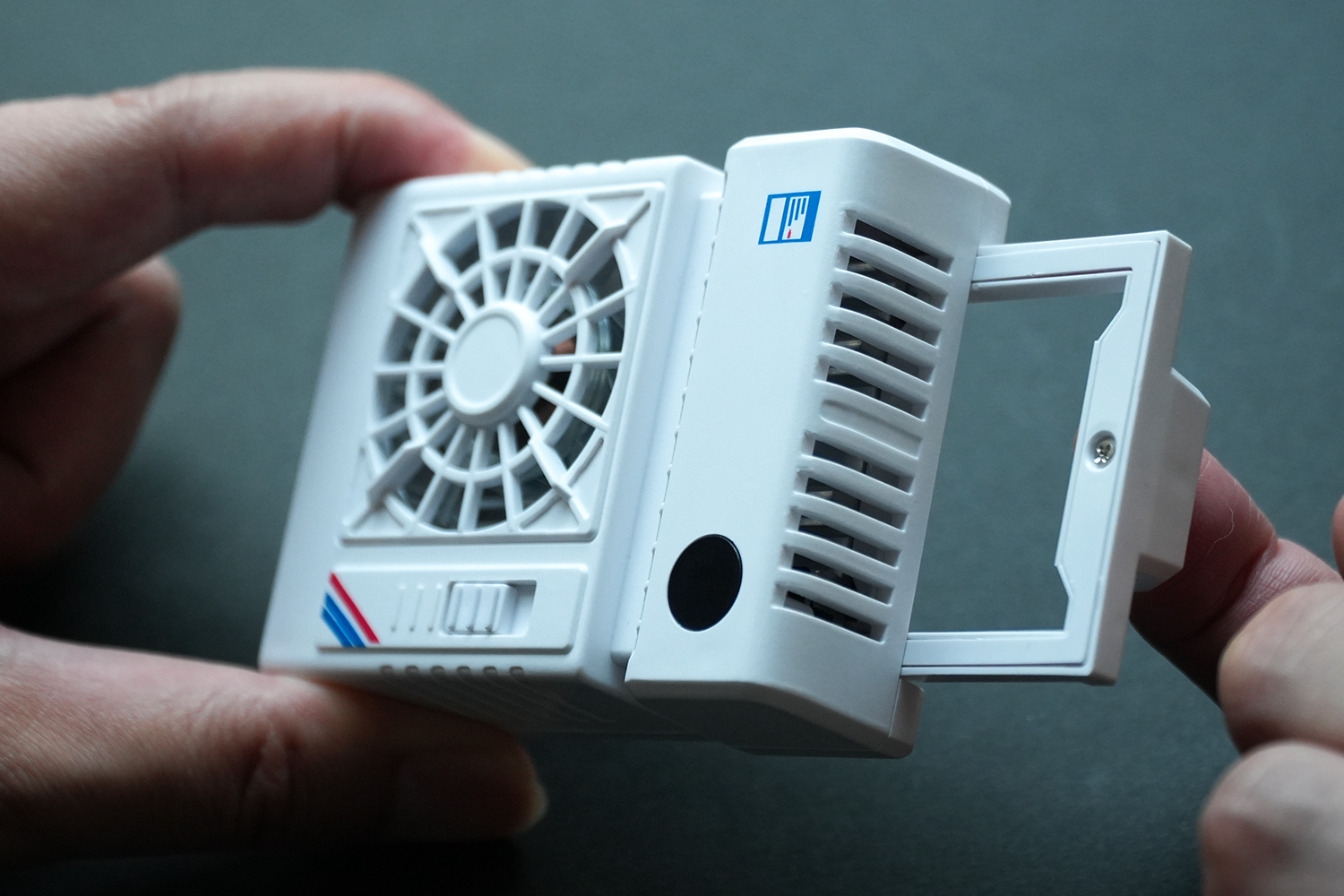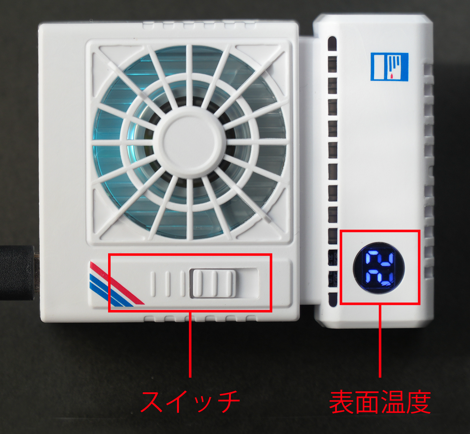 室外機のファンの近くにあるスイッチをスライドすると動作し、数秒で冷却を開始。スイッチは1つスライドすると「低速モード」、2つスライドすると「高速モード」と2段階のモード切り替えができます。控えめな冷却で長く使いたい場合は低速モード、早くしっかり冷却したい場合は高速モードと用途に応じて使い分けができます。本体に表面温度が表示されるので、その数値をもとにどちらのモードを使用するか決めてもよいでしょう。