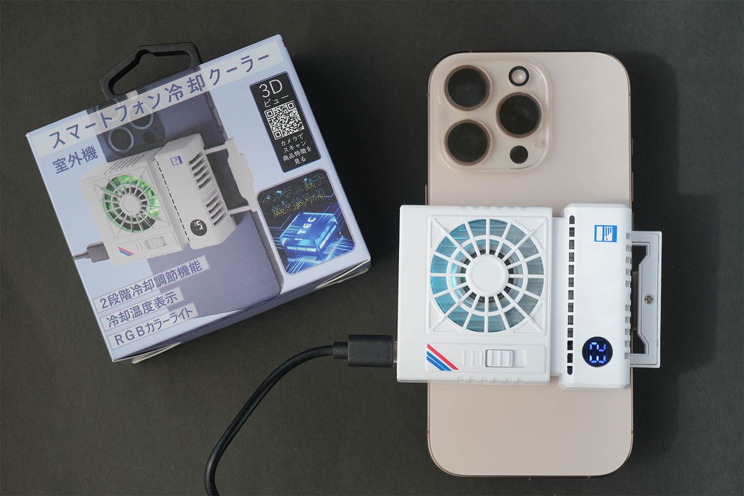 「スマートフォン冷却クーラー 室外機」には、長さ約120cmのUSBケーブル(Type-C)が付属しています。5V/1.5A以上のUSB電源やPCのUSBポートに接続することが推奨されていて、USBハブや延長USBケーブルなどを挟むと駆動しない場合があるので、そこは注意が必要です。