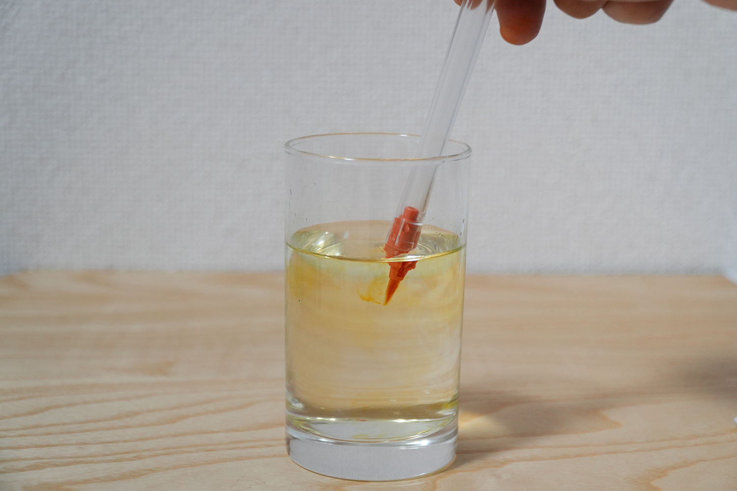 注射器のような形をした洗浄器本体の先に洗浄ノズル、その先に「ブラッシュ」のペン先をとりつけます。次に、ペン先を水の中に入れ、後ろのプランジャー部分を上下して水を吸い上げて後ろから押し出すことで穂先を洗浄します。筆は根本に色が残りがちだけれど、あまりぎゅうぎゅう洗うと痛めてしまうという悩みがありましたが、後ろから水を流すことで根本からきれいになります。この仕組みも、一般的な絵筆や書道筆に採用してほしいと思うくらい便利でした。